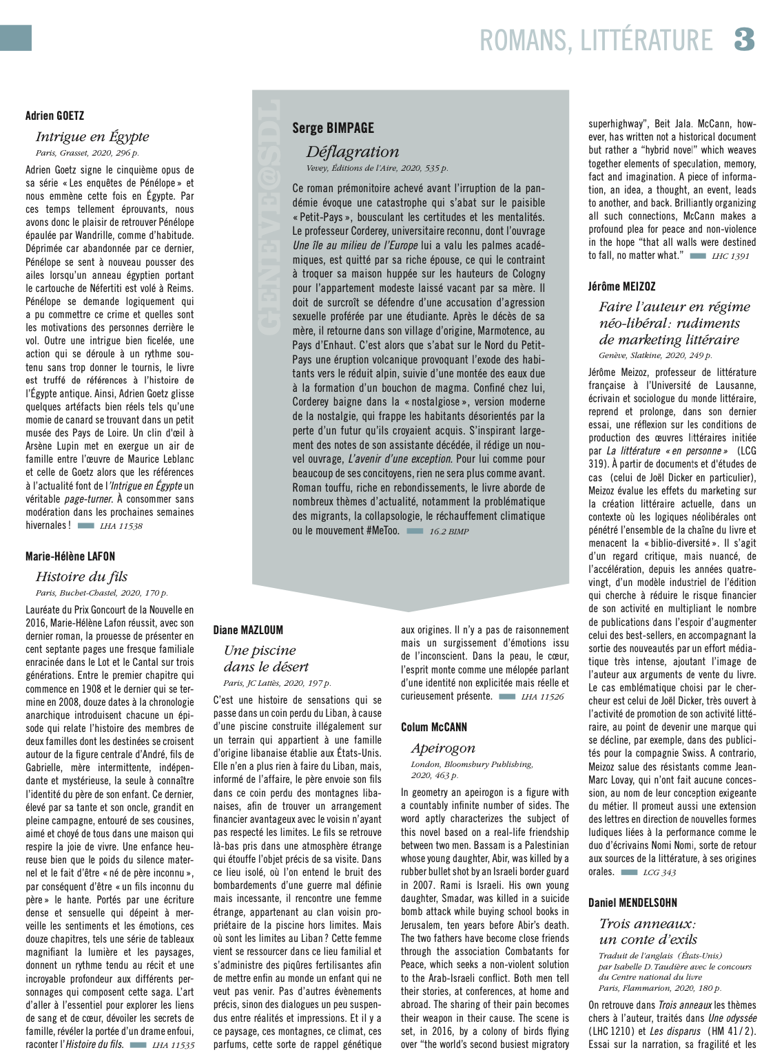 Fable romanesque prémonitoireEt si la Suisse était menacée d’un péril conduisant à confiner ses habitants? Un air de déjà-vu? L’idée de son septième roman est pourtant venue au Genevois Serge Bimpage il y a trois ans lors d’un séjour au sud de l’Italie avec vue sur le Stromboli, et le livre a été accepté par l’éditeur le 6janvier. Une Suisse renommée «Petit pays» s’y trouve aux prises avec une éruption volcanique, que l’auteur a imaginée plus à titre de métaphore que dans une visée d’anticipation. À l’aune de cette nouvelle donne, il examine la vie de l’historien Julius Corderey, professeur réputé, «décoré de l’Ordre des Palmes académiques». Bien installé dans ses certitudes comme dans sa demeure chic de Genève, puis replié dans l’appartement de sa mère décédée après la cinquième rupture avec son épouse, il n’aurait jamais imaginé devoir se réfugier à Marmotence, le village de montagne de son enfance, pour un interminable hiver où il devra même partager son chalet avec une réfugiée venue de Suisse alémanique. Teinté d’ironie, ce foisonnant roman questionne par la multiplicité des personnages, des points de vue et des thèmes la position de la Suisse, les certitudes trop bien ancrées, mais aussi le potentiel de changement d’une telle crise.